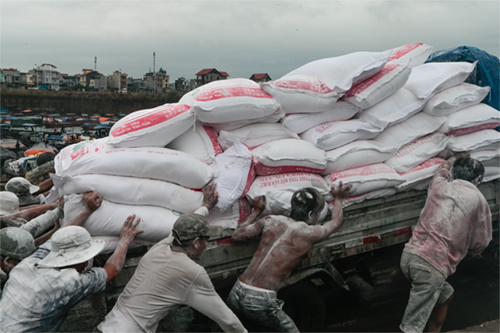 Tại bến cảng biên giới Đông Hưng, mười mấy công nhân Việt Nam đang bốc dỡ tinh bột sắn từ thuyền lên xe ôtô. Bột trắng bám đầy đầu tóc, dính chặt vào quần áo họ.